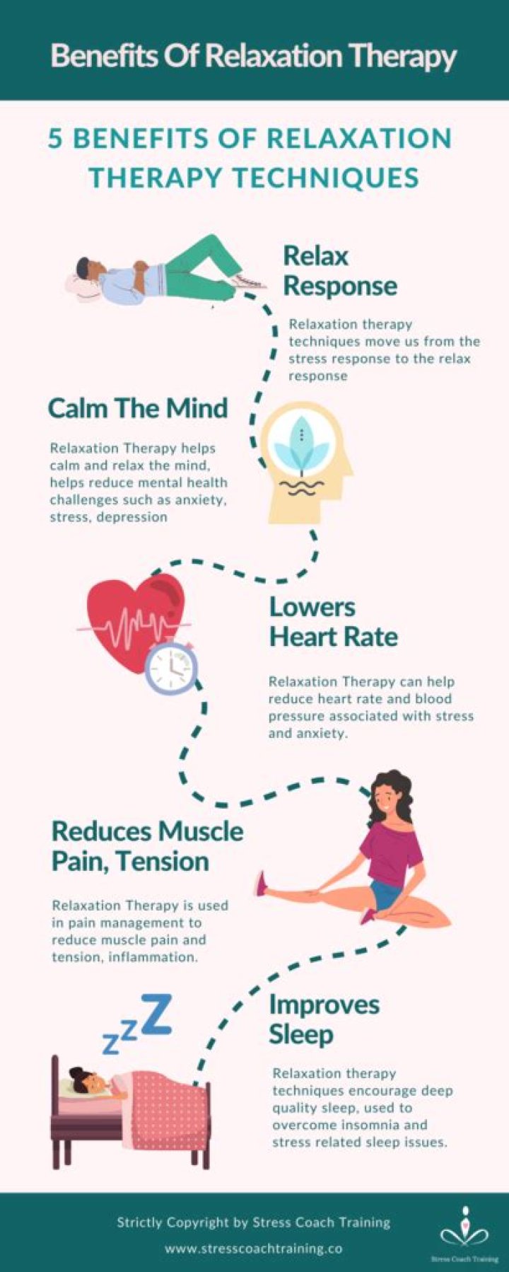 Progressive relaxation yields a variety of benefits, including the development of a feeling of well-being, lowered blood pressure, decreased muscle tension, thereby reducing the body’s need for oxygen and reducing fatigue and anxiety.