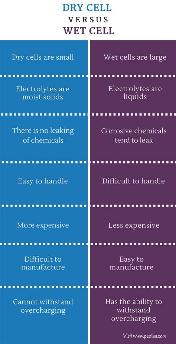Simple cell has liquid chemicals and it is difficult to carry from one place to another. Dry cell has no solution. So, it is easier to carry it from one place to another and there is no risk of spilling acid from the dry cell.What do the wet cells and the dry cells produce?