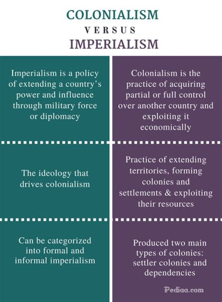 Colonialism is where one nation assumes control over the other and Imperialism refers to political or economic control, either formally or informally.