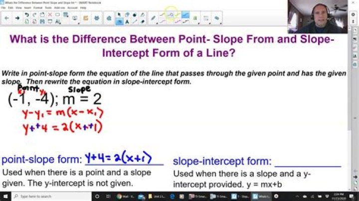 Explanation: If a straight line passes through (x1,y1) and has a slope m , then its equation can be written as y−y1=m(x−x1) . →y=−3x+3 which is of the form y=mx+c (slope intercept form.What is the difference of Y intercept?