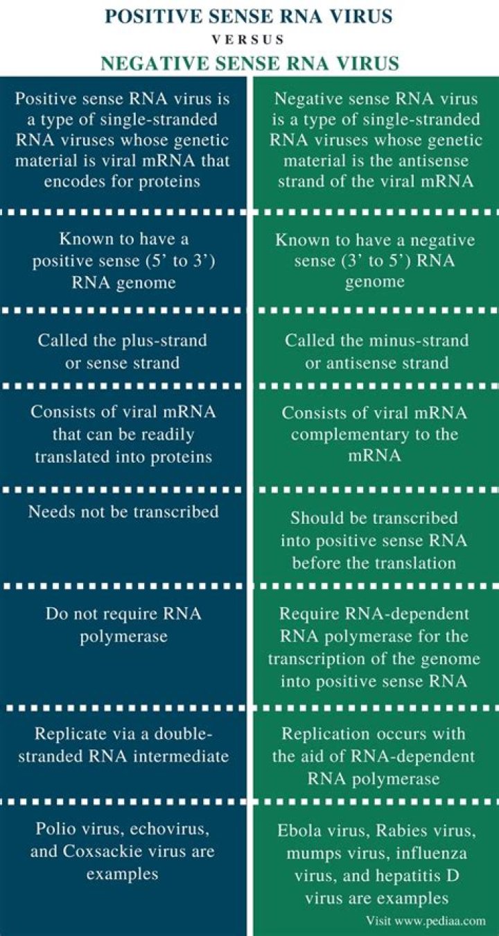 Positive-sense viral RNA is similar to mRNA and thus can be immediately translated by the host cell. Negative-sense viral RNA is complementary to mRNA and thus must be converted to positive-sense RNA by an RNA polymerase before translation.