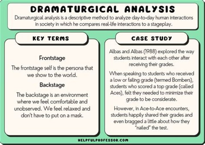 Dramaturgy analyses social interactions as a series of theatrical performances. Normal life is compared to a play on stage and humans are the actors in the play of life. … It believes that everyday social situations are manipulated by people to convey a specific desired impression.