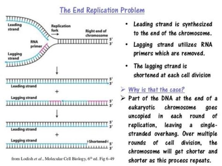 The end-replication problem The DNA at the very end of the chromosome cannot be fully copied in each round of replication, resulting in a slow, gradual shortening of the chromosome.