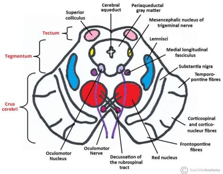 Tectum damage Damage to the tectum of the midbrain may present as Parinaud’s syndrome. In this scenario, the patient will be unable to gaze upwards or downwards, as the corpora quadrigemini will be affected. An aneurysm in the posterior cerebral artery at the circle of Willis can result in Weber’s syndrome.