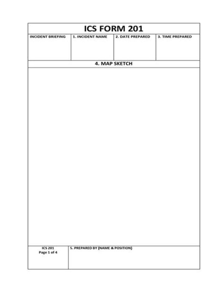 ICS Form 201: Contains status information for briefing the incoming Incident Commander or team, or other resources.