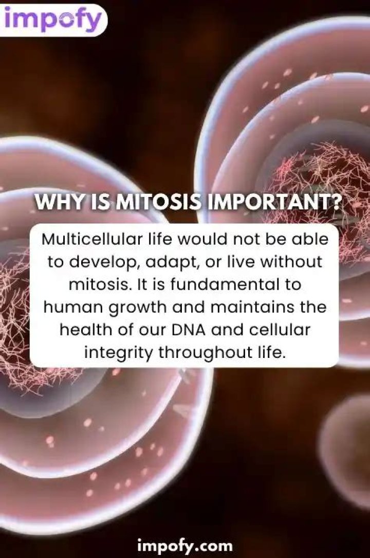 Answer 2: Mitosis is the process by which cells divide. Without it, you could make no new cells. The cells in most of your body would wear out very quickly, greatly shortening your life.