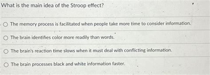 What is the main idea of the Stroop effect? The brain’s reaction time slows when it must deal with conflicting information. In order to remember his lines for the play, Guy repeats his lines over and over again.