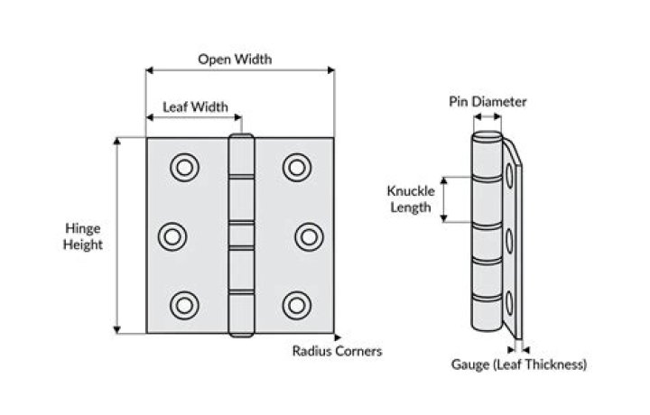 Know Your Way Around A Hinge: Hinges are measured from top to bottom and side to side. This bit is pretty straightforward. … For a standard door, you’ll take the width by using a tape measure and measure at the center. For the height, hook the tape measure to the top of the door and stretch it to the very bottom.