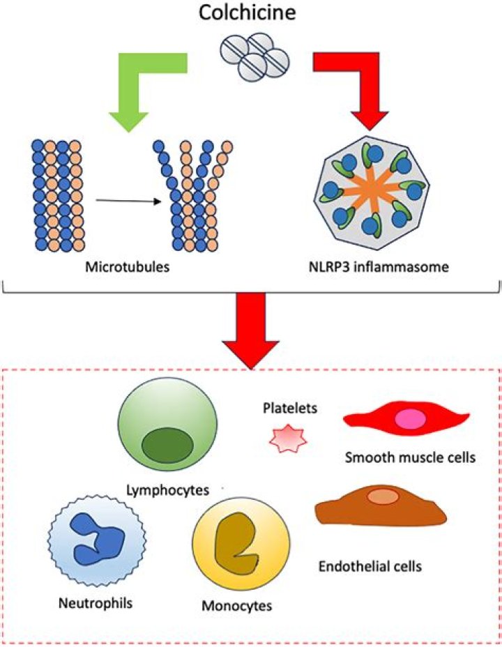 Colchicine has several potential mechanisms of action, including reducing the chemotaxis of neutrophils, inhibiting inflammasome signaling, and decreasing the production of cytokines, such as interleukin-1 beta.