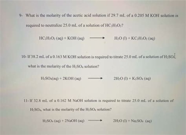 Use the titration formula. If the titrant and analyte have a 1:1 mole ratio, the formula is molarity (M) of the acid x volume (V) of the acid = molarity (M) of the base x volume (V) of the base. (Molarity is the concentration of a solution expressed as the number of moles of solute per litre of solution.)