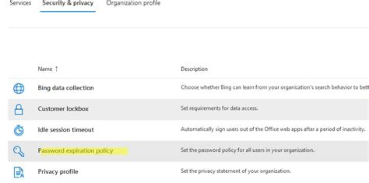 In the Microsoft 365 admin center, go to the Security & privacy tab. If you aren’t a global admin, you won’t see the Security and privacy option. Select Password expiration policy. If you don’t want users to have to change passwords, uncheck the box next to Set user passwords to expire after a number of days.
