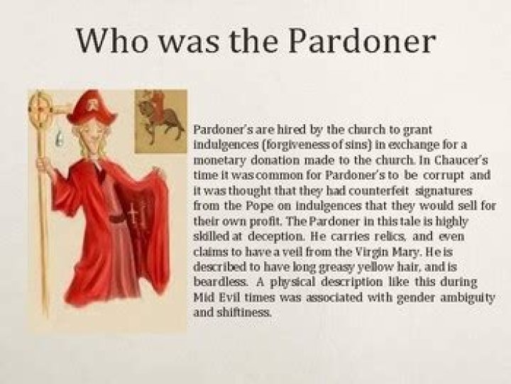 The pardoner admits to drinking but later preaches against it, his hypocrisy knows no bounds as he makes others feel guilty for something that he himself does, after all, isn’t he telling the story while inside a bar.What is another word for Pardoner?