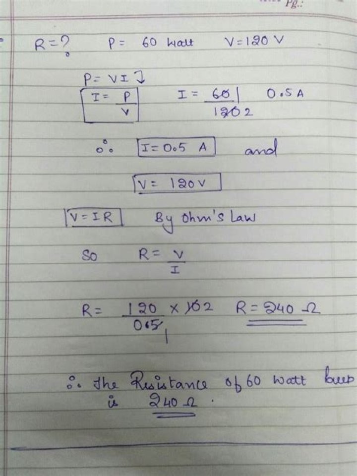 Resistance equals voltage divided by current. Volt is 230 , Power is 100 watts (bulb), Amps / Current is 0.434, Resistance is 529.953 Ohms. to obtain the resistance of a 100 watt bulb its’s 230 volts divided by amps / current 0.434 = 529.953 Ohms.What is the resistance of a 40 watt bulb?