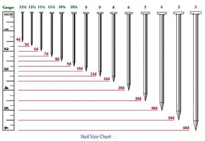 So, a 2d nail is 1 inch long. More common nail sizes: a 4d nail measures 1.5 inches, a 6d nail is 2 inches long, an 8d nail is 2.5 inches long, a 12d nail is 3.25 inches long, and 16d nails are 3.5 inches long.