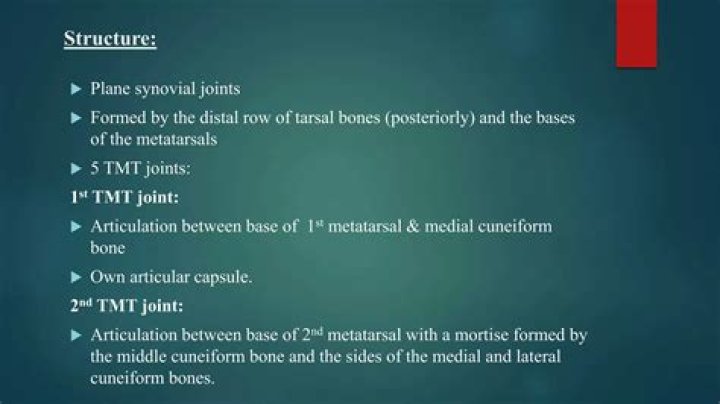 The tarsometatarsal joints (Lisfranc joints) are arthrodial joints in the foot. The tarsometatarsal joints involve the first, second and third cuneiform bones, the cuboid bone and the metatarsal bones.