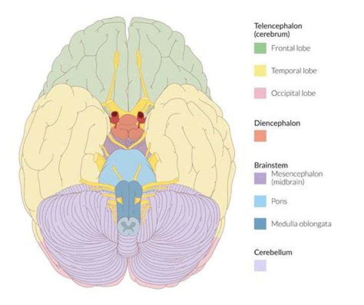 The brain can be divided into three basic units: the forebrain, the midbrain, and the hindbrain. The hindbrain includes the upper part of the spinal cord, the brain stem, and a wrinkled ball of tissue called the cerebellum (1).