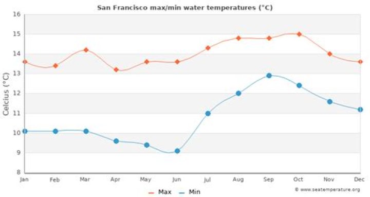 The ocean off San Francisco is at its warmest from mid August to late September when the temperature averages 60 degrees Fahrenheit (15.5 degrees Celsius). The coolest months are January and February, when the sea temperature is typically at 53 °F (11.7 ° C).