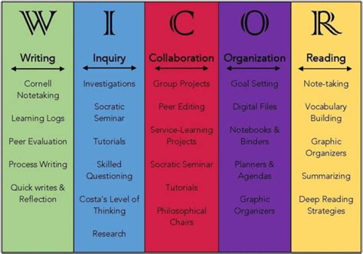 The focus of these strategies is on promoting rigor through WICOR: Writing, Inquiry, Collaboration, Organization and Reading. These methods increase engagement through student ownership, accountability, and critical thinking.