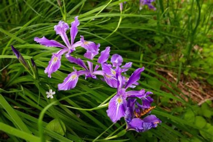 Wild iris typically has leaves and flower stalk about a foot tall, but it can grow to 2 feet tall. Flowers are about 3 inches in diameter. Iris color variations exist, but in this region the color is mainly shades of blue/purple with a rare white flower.