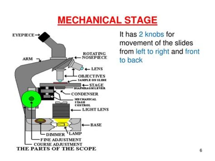 They have stage clips that hold the specimen slides in place. The most common stage is a mechanical stage, which allows the control of the slides by moving the slides using the mechanical knobs on the stage instead of moving it manually.