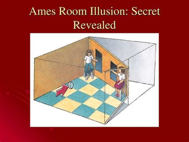 An Ames room is a distorted room that creates an optical illusion. Likely influenced by the writings of Hermann Helmholtz, it was invented by American scientist Adelbert Ames, Jr. in 1946, and constructed in the following year. An Ames room is viewed with one eye through a peephole.