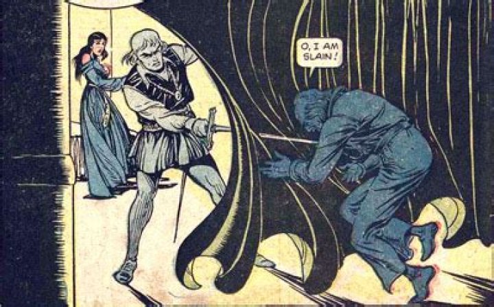 Polonius hides behind Gertrude’s curtain to eavesdrop, but calls out in fear after Gertrude does so. Hamlet hears him and stabs him through the curtain, killing him. The prince angrily confronts his mother, and, hearing Polonius’s calls for help, mistakes him for Claudius and stabs him through the curtain.