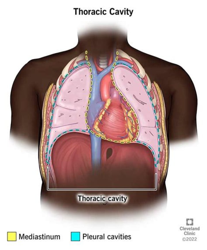 Thoracic cavity–the space occupied by the ventral internal organs superior to the diaphragm.