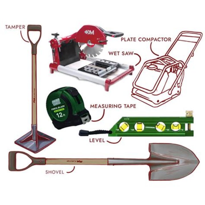 Shovel.Tape Measure.Landscaping Rake.Tamper or Plate Compactor.Rubber Mallet.Hammer.Wheelbarrow.Circular Saw with Concrete Blade.
