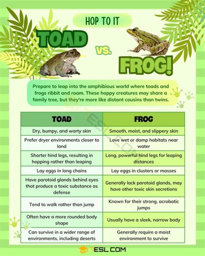 Frogs have long legs, longer than their head and body, which are made for hopping. Toads, on the other hand, have much shorter legs and prefer to crawl around rather than hop. Frogs have smooth, somewhat slimy skin. Toads have dry, warty skin.