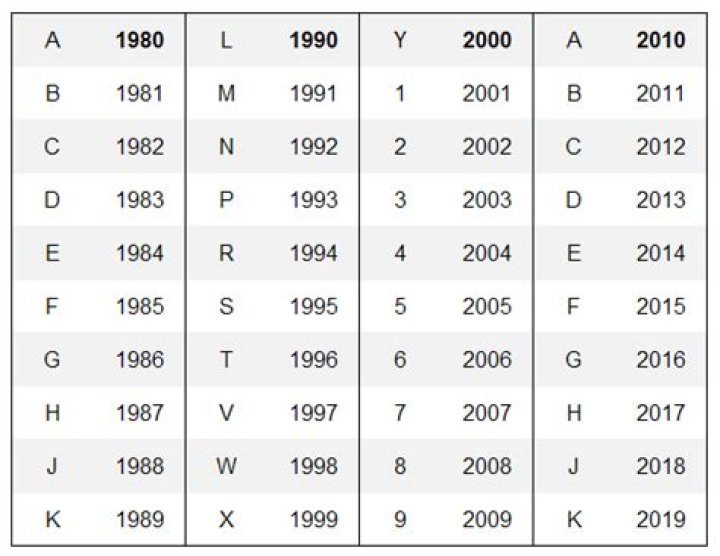 In each VIN number, there will be one code representing the month of production and another code indicating the year of production. However, each car brand will locate the month code and year code in a different position. Check the table below to find the location of these codes in a VIN number.