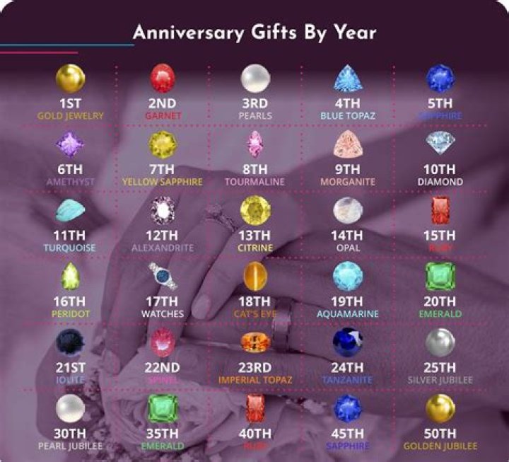 These gifts vary in different countries, but some years have well-established connections now common to most nations: 5th Wood, 10th Tin, 15th Crystal, 20th China, 25th Silver, 30th Pearl, 35th Jade, 40th Ruby, 45th Sapphire, 50th Gold, 60th Diamond, and 70th Platinum.