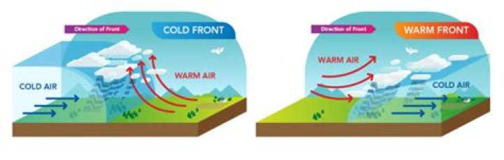 The same rules apply to air densities. Cold air is more dense than warm air. So, when a cold front approaches a town, the cold air will quickly force the warm air upwards. When there’s enough moisture with an air mass, this can trigger cloudy, rainy and even stormy conditions.