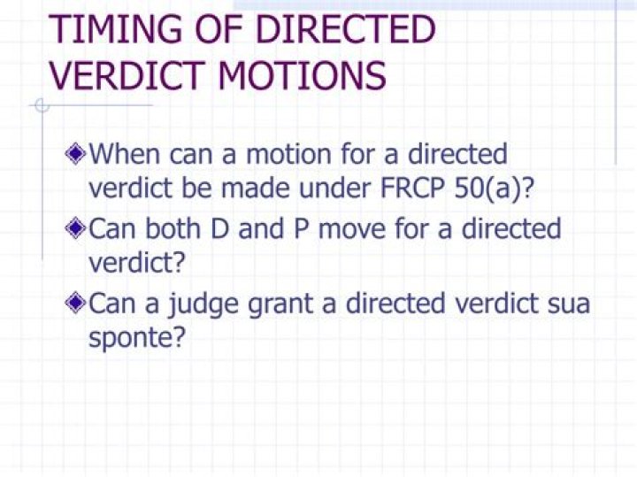 A directed verdict is only proper in situations where a reasonable jury could not find for the opposing party. The defendant can move for a directed verdict after the plaintiff rests her case. If the judge grants this motion, the case is over and the defendant wins.
