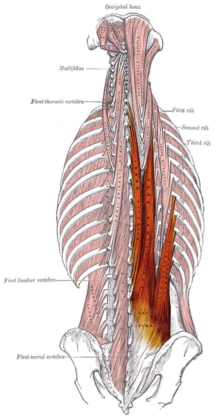 The erector spinae is attached to the medial crest of the sacrum (a slightly raised feature of the sacrum closer towards the midline of the body as opposed to the “lateral” crest which is further away from the midline of the body), to the spinous processes of the lumbar, and the eleventh and twelfth thoracic vertebrae …
