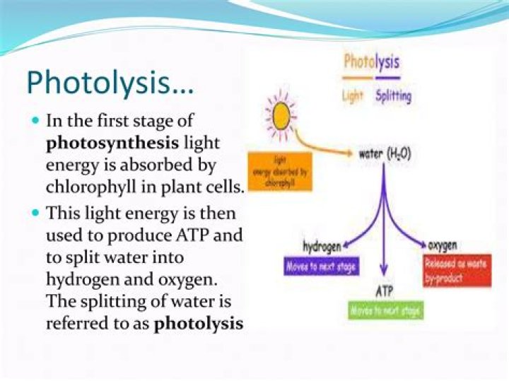 Photolysis of water: Photolysis of water means the splitting of water molecules in the presence of light or photons into hydrogen ions, oxygen and electrons. … – Photosynthesis is a process by which plants make their own food with the help of Sunlight, Water, Carbon Dioxide and Chlorophyll.