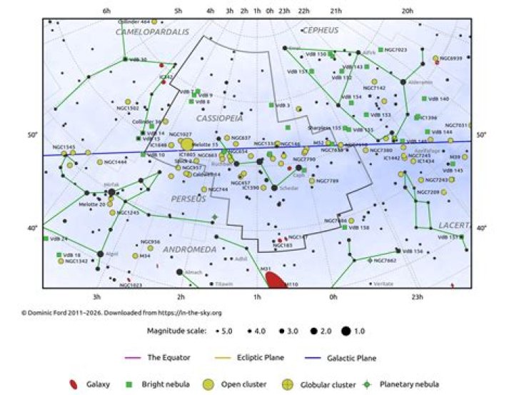 Cassiopeia is the 25th largest constellation in the night sky, occupying an area of 598 square degrees. It lies in the first quadrant of the northern hemisphere (NQ1) and can be seen at latitudes between +90° and -20°. The neighboring constellations are Andromeda, Camelopardalis, Cepheus, Lacerta, and Perseus.