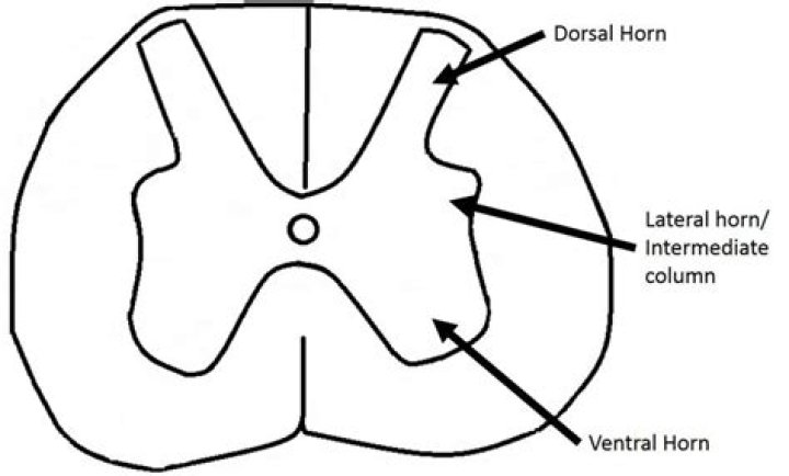 The posterior horn is responsible for sensory processing. The anterior horn sends out motor signals to the skeletal muscles. The lateral horn, which is only found in the thoracic, upper lumbar, and sacral regions, is the central component of the sympathetic division of the autonomic nervous system.