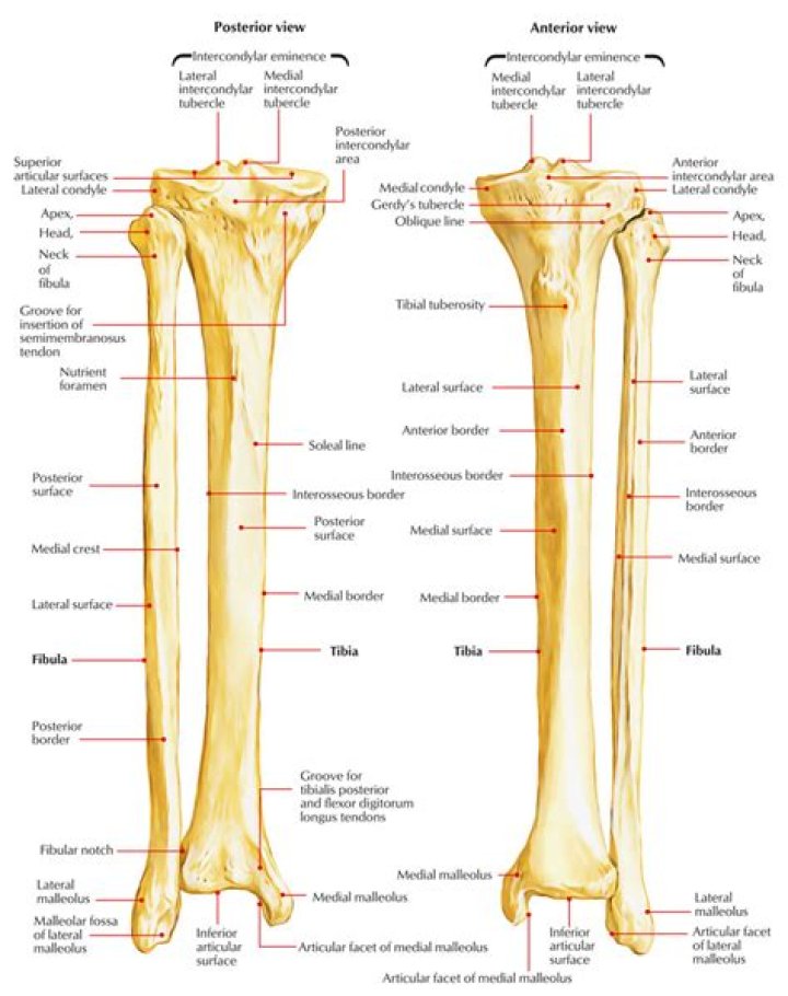 Tibia and fibula are the two long bones located in the lower leg. The tibia is a larger bone on the inside, and the fibula is a smaller bone on the outside. The tibia is much thicker than the fibula.