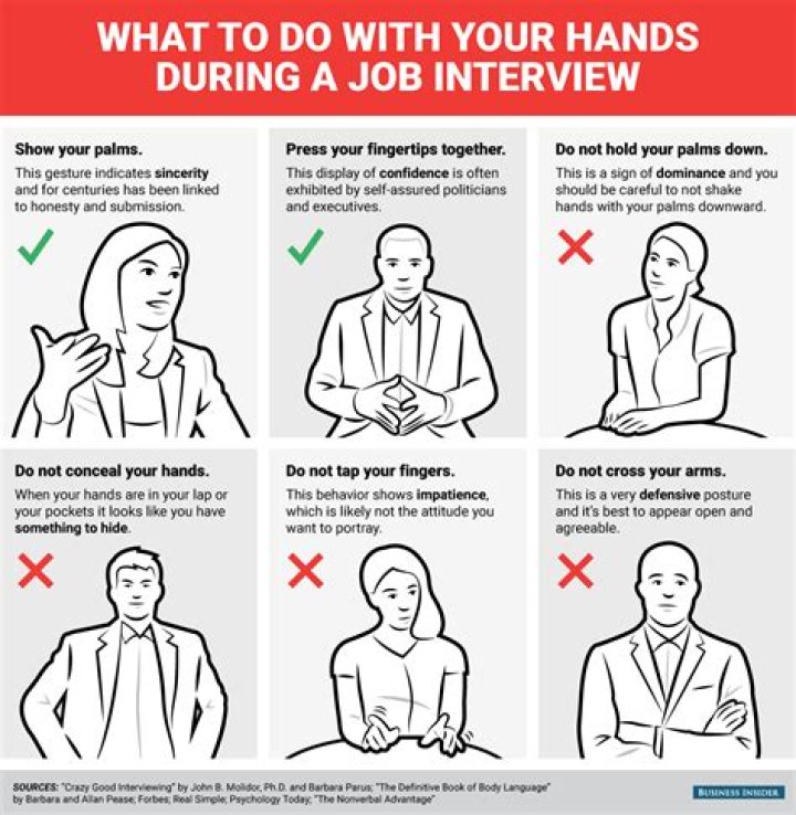 During an interview, Drexler advises that you use your hands to express yourself because it makes you appear more at ease, which then puts the interviewer at ease. “If you watch someone talk, they’re moving their arms,” he explains. … If you’re talking about the job or the company, you can gesture to the office.