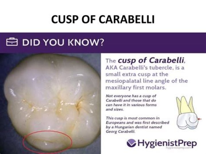The cusp of Carabelli, or Carabelli’s tubercle, or tuberculum anomale of Georg Carabelli is a small additional cusp at the mesiopalatal line angle of maxillary first molars. This extra cusp is usually found on the second molar, and becomes progressively less likely in the first, third molars.
