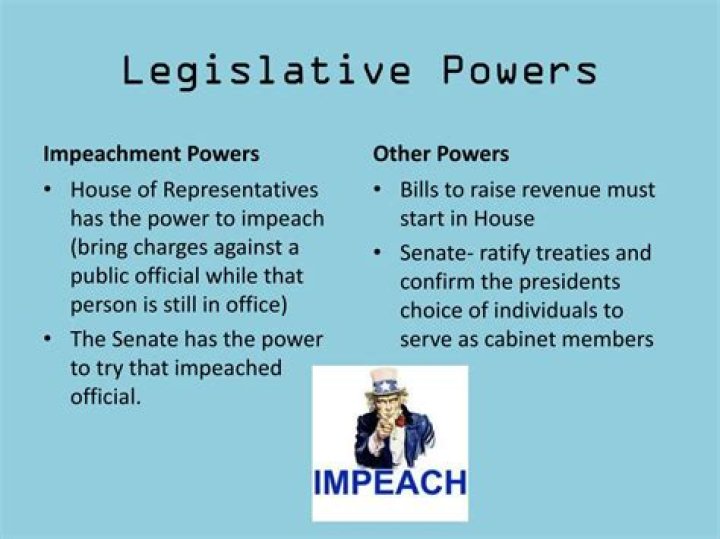 House of representatives have sole power to impeach and bring charges (51 majority). Senate have sole power to try (judge) impeachment cases. Senators are the jurors. chief justice of the supreme court is the presiding judge.Who holds legislative power?