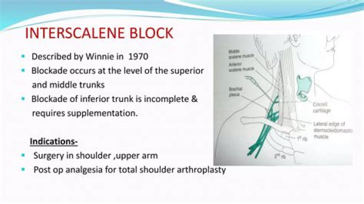 Simply stated, an Interscalene block will numb your shoulder and arm before surgery so that your brain will not receive any pain signals during and immediately after surgery. The block involves injecting numbing medication near the nerves that regulate sensation in the shoulder and arm.