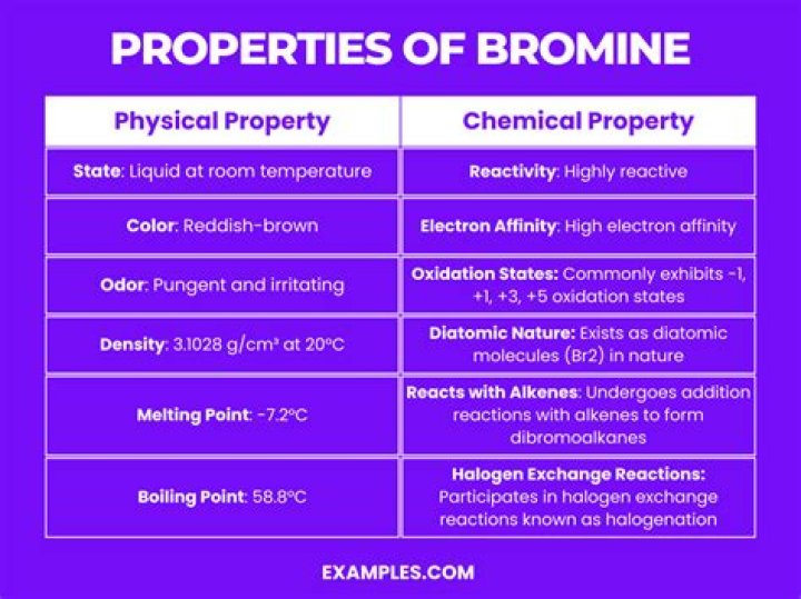 atomic number35melting point−7.2 °C (19 °F)boiling point59 °C (138 °F)specific gravity3.12 at 20 °C (68 °F)oxidation states−1, +1, +3, +5, +7