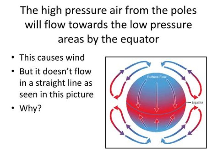 Explanation: Air pressure is highest at the equator, and much lower at the poles. Guy-Lussac’s Law states that pressure is proportional to temperature at constant volume.